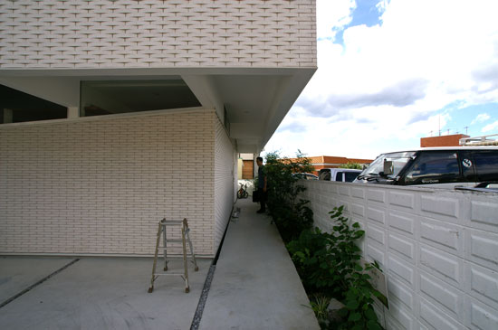 アプローチ沿いにあるご主人が真っ白に塗られた既存ブロックをバックに