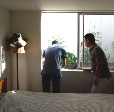 寝室との間に取られた路地状の南側庭にもリゾートぽい植物が植えられており