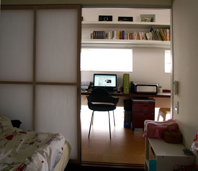 ベッドが置いておる子供室の先に床が少し上がってスタディーコーナーがあり
