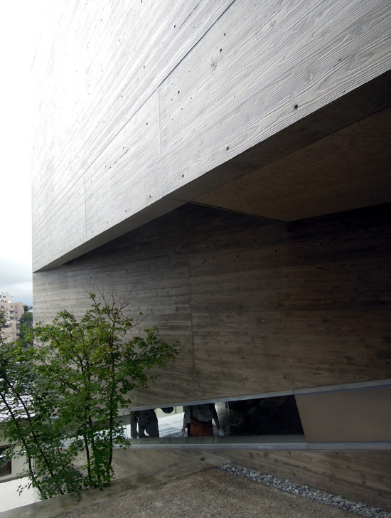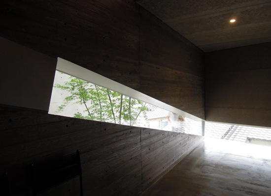 敷地アウトラインに合わせた矩形のコンクリートフレームの中に斜めの壁を
