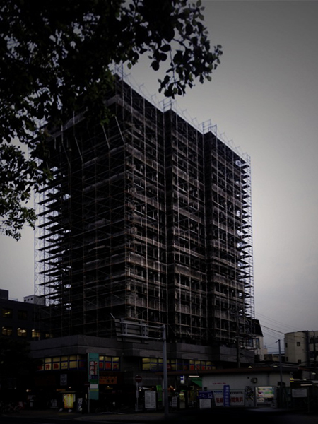 すると向かい側のマンションに足場が掛けられており
