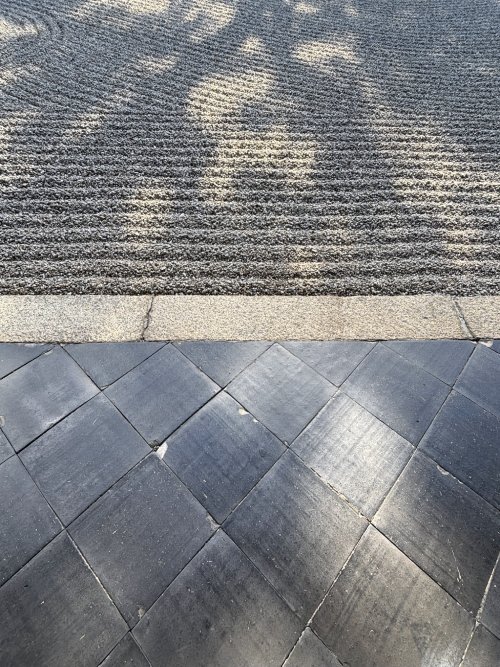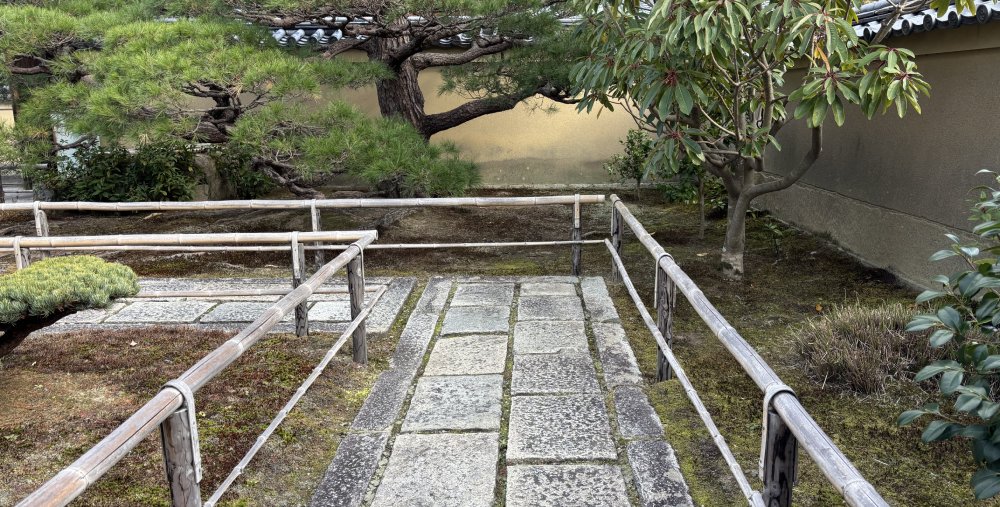 ここは大徳寺境内内の別の塔頭ですがここでは石畳がまっすぐに通さずズラシの手法で両サイドのグリーンに変化を与えています。