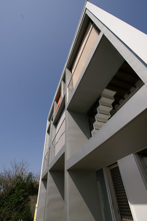 キュービックな建物に取り込まれた外部デッキが連続します。